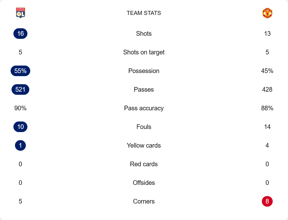 โอลิมปิก ลียง มีจำนวนการครองบอลอยู่ที่ 55% เทียบกับ แมนเชสเตอร์ ยูไนเต็ด ที่ทำได้ 45% โดยลียงต่อบอลมากถึง 521 ครั้ง ความแม่นยำอยู่ที่ 90% ขณะที่ยูไนเต็ดผ่านบอล 428 ครั้ง แม่นยำ 88% ทั้งสองทีมมีโอกาสยิงใกล้เคียงกัน ลียง 16 ครั้ง เข้ากรอบ 5 เท่าแมนยูที่ยิง 13 ครั้ง เข้ากรอบเท่ากัน 5 ครั้ง แต่แมนยูได้เตะมุมมากกว่าถึง 8 ครั้ง ลียงมีแค่ 5 ครั้ง ส่วนเรื่องเกมรับ แมนยูโดนใบเหลืองไป 4 ใบจากการทำฟาวล์ 14 ครั้ง ลียงฟาวล์น้อยกว่าแค่ 10 ครั้ง และโดนใบเหลืองแค่ใบเดียว