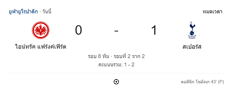 เกมนี้สะท้อนชัดว่า สเปอร์ส เล่นด้วยความเก๋า เกมรุกแม้อาจไม่เร้าใจ แต่เมื่อได้ประตูจากจุดโทษก็คุมเกมแบบมืออาชีพ เน้นลดความเสี่ยง ไม่เปิดพื้นที่ให้เจ้าถิ่นได้เล่นง่าย ขณะที่ แฟร้งค์เฟิร์ต แม้จะมีโอกาสยิงเยอะ แต่ความเฉียบคมหน้าเขตโทษคือปัญหาหลักที่ทำให้ต้องหยุดเส้นทางเพียงแค่รอบนี้ และ ผลบอลสด ก็แสดงให้เห็นแล้วว่า ทีมที่มีความนิ่งและสมดุลมากกว่า คือฝ่ายที่สมควรไปต่อ