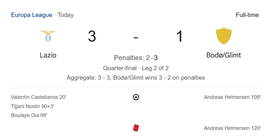 ช่วงต่อเวลาพิเศษนาทีที่ 99 ลาซิโอยังโหมบุกต่อเนื่อง และมาได้ประตู 3-0 จาก บูลาเย่ ดิยา จุดไฟความหวังเต็มพิกัด แต่แล้วนาที 109 อันเดรียส เฮลเมอร์เซ่น กองหน้าของโบโด กลิมท์ก็มาซัดตีไข่แตกให้ทีมเยือน ไล่มา 3-1 และในช่วงท้ายเกม เฮลเมอร์เซ่น ยังมาโดนใบแดงไล่ออกไปด้วยจากการทำฟาวล์รุนแรง อย่างไรก็ตาม เมื่อจบ 120 นาทีรวมผลสองนัดยังเสมอกัน 3-3 ต้องไปวัดกันที่จุดโทษ ก่อนที่โบโด กลิมท์จะดวลแม่นกว่าชนะไป 3-2 แบบสุดดราม่า