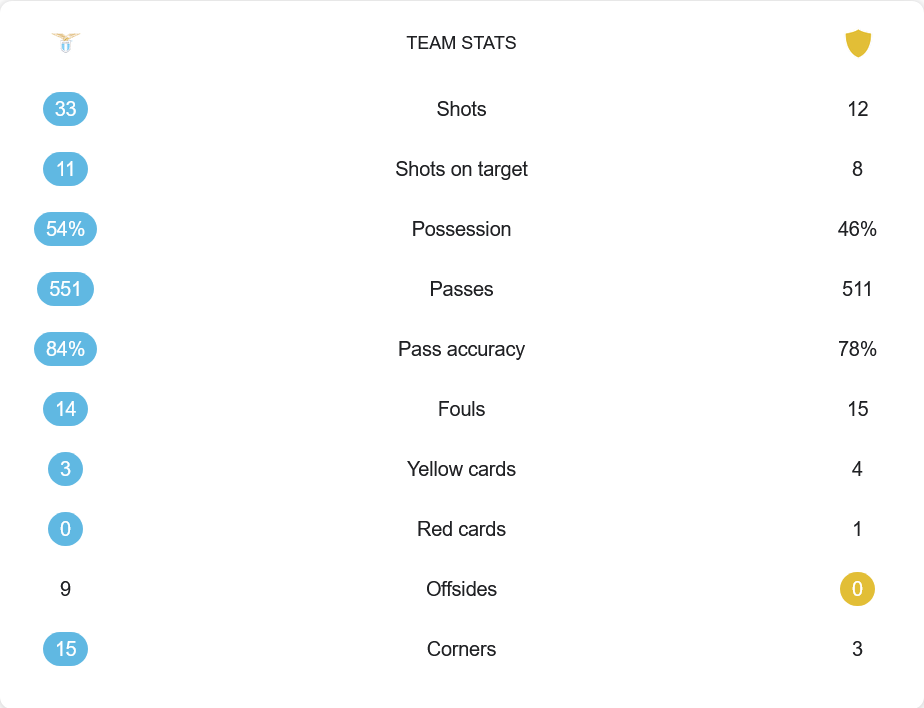 ตลอดทั้งเกม ลาซิโอแสดงให้เห็นถึงความดุดันในแนวรุกด้วยการยิงมากถึง 33 ครั้ง ตรงกรอบ 11 ครั้ง และครองบอลเหนือกว่าที่ 54% ส่วนโบโด กลิมท์มีโอกาสยิงเพียง 12 ครั้ง แต่เข้ากรอบถึง 8 ครั้ง แสดงให้เห็นว่าพวกเขาเน้นการจบสกอร์คม ๆ มากกว่าครองเกม การผ่านบอลของลาซิโอแม่นยำกว่าที่ 84% เทียบกับโบโด กลิมท์ที่ 78% โดยรวมแล้วเป็นเกมที่ลาซิโอคุมรูปเกมได้เหนือกว่า แต่ความเฉียบคมในช่วงยิงจุดโทษกลับเป็นปัญหาใหญ่จนต้องจอดแค่รอบนี้