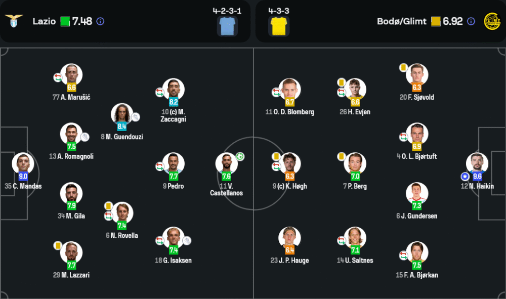 ในเกมนี้ ลาซิโอเลือกใช้แผน 4-2-3-1 เน้นการตั้งเกมจากแดนกลางโดยมี เกนดูซี และ โรเวลล่า เป็นแกนเชื่อมเกม พร้อมให้ อิซัคเซ่น, เปโดร และ ซัคคาญี่ เติมเกมรุกอย่างต่อเนื่อง การขึ้นบอลของลาซิโอใช้การต่อบอลสั้นและฉีกแนวรับด้วยการสอดแทรกจากริมเส้น ขณะที่โบโด กลิมท์ ใช้ 4-3-3 เล่นแบบมีระเบียบมากขึ้น โดยพยายามตั้งรับลึกและโต้กลับเร็วผ่านตัวริมเส้นอย่าง บลอมเบิร์ก และ อีฟเยน ช่วงแรกพวกเขาสู้ได้ดี แต่เมื่อโดนกดดันหนักและเสียประตู ทำให้เกมรุกแทบไม่มีโอกาสจบสกอร์ชัดเจน การวิเคราะห์จากบ้านกีฬาในมุม วิเคราะห์บอล พบว่าจุดตายของโบโด กลิมท์คือการเสียสมาธิในช่วงเวลาสำคัญและเสียบอลง่ายในแดนตัวเอง