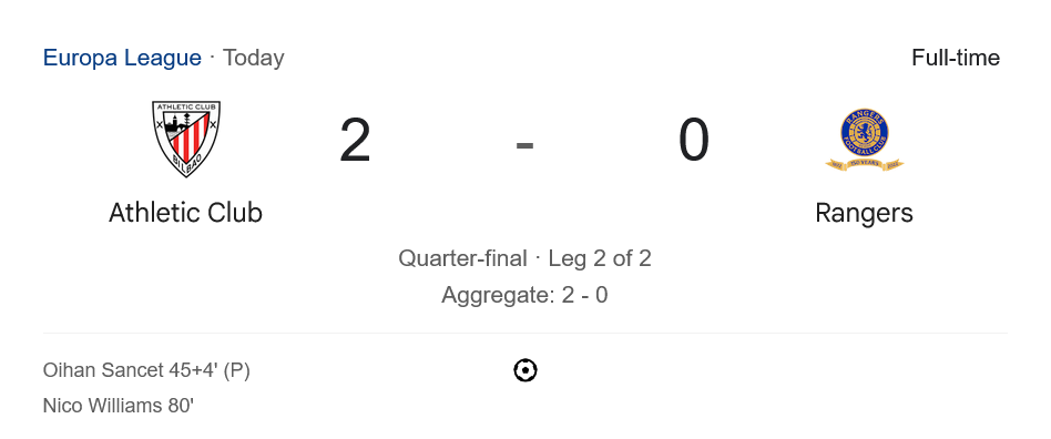 ชัยชนะ 2-0 นี้ส่งให้แอธเลติก บิลเบาทะลุเข้าสู่รอบรองชนะเลิศ ยูฟ่ายูโรปาลีก 2025 ได้อย่างสง่างาม ขณะที่เรนเจอร์สต้องเก็บกระเป๋ากลับบ้านอย่างน่าเสียดาย บ้านผลบอล ยืนยันว่าผลงานบิลเบาครั้งนี้คือหนึ่งในเกมที่พวกเขาโชว์ฟอร์มได้ดีที่สุดในซีซั่นยุโรป