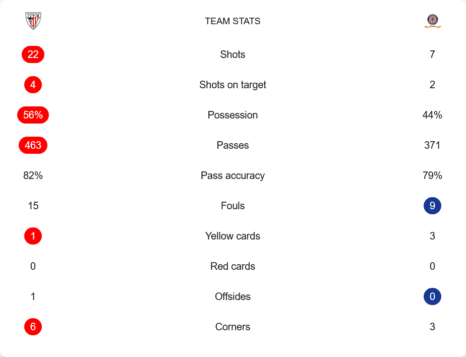 สถิติจากเกมนี้สะท้อนให้เห็นความเหนือกว่าของแอธเลติก บิลเบาอย่างชัดเจน โดยพวกเขาครองบอลได้ 56% มีโอกาสยิงถึง 22 ครั้ง เข้ากรอบ 4 ครั้ง ขณะที่เรนเจอร์สมีโอกาสยิงเพียง 7 ครั้งและตรงกรอบแค่ 2 หนเท่านั้น บิลเบามีการจ่ายบอลสำเร็จ 82% จากทั้งหมด 463 ครั้ง ส่วนเรนเจอร์สจ่ายสำเร็จ 79% จาก 371 ครั้ง แม้จำนวนฟาวล์ของบิลเบาจะมากกว่าที่ 15 ครั้งเทียบกับเรนเจอร์ส 9 ครั้ง แต่ก็ไม่มีผลต่อเกมเท่าไหร่นัก เพราะเกมรับของเจ้าถิ่นแน่นหนาและเล่นอย่างมีวินัยกว่าอย่างเห็นได้ชัด