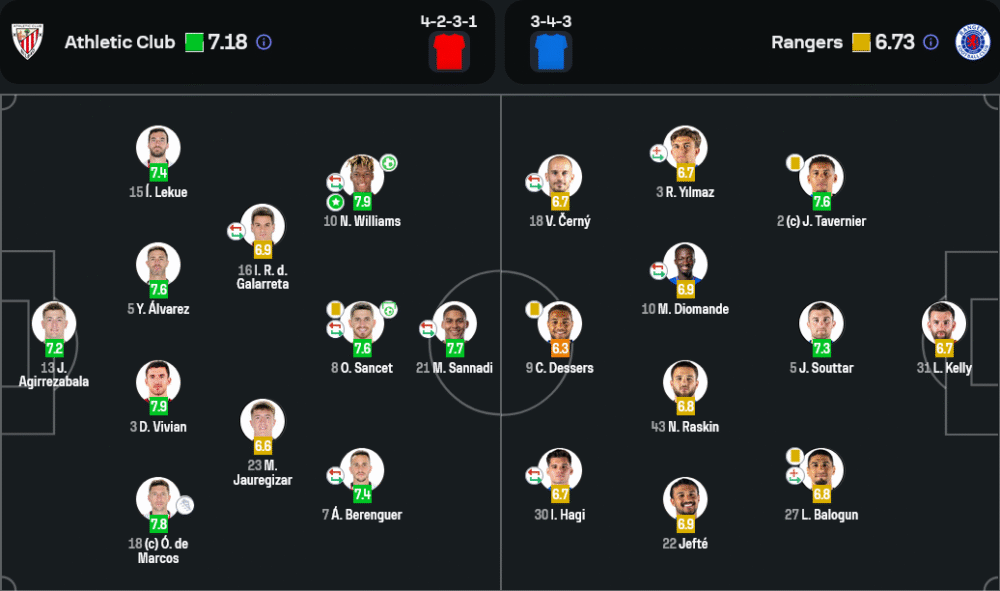 เกมนี้ แอธเลติก บิลเบา ยังคงเลือกใช้แผน 4-2-3-1 ที่เน้นการบุกจากปีกสองข้าง โดยเฉพาะ นิโก้ วิลเลียมส์ ที่ระเบิดฟอร์มลากเลื้อยจนแผงหลังเรนเจอร์สแทบเอาไม่อยู่ เมื่อได้บอลจะเร่งสปีดกระชากแหวกแนวรับ ก่อนจบสกอร์หรือเปิดให้เพื่อนร่วมทีม ส่วนฝั่งเรนเจอร์สในแผน 3-4-3 ดูเหมือนเน้นตั้งรับแน่นหนาแล้วรอโต้กลับเร็ว แต่การผ่านบอลในแดนกลางยังมีความผิดพลาดบ่อยครั้งทำให้เสียการครองบอล บ้านกีฬา วิเคราะห์ว่าในแง่ วิเคราะห์บอล แอธเลติก บิลเบามีแผนการบุกที่เฉียบขาดกว่า และรู้จักใช้จังหวะฆ่าเกมได้อย่างมีประสิทธิภาพ แตกต่างจากเรนเจอร์สที่ไม่สามารถหาพื้นที่เข้าทำได้เลยตลอดทั้งเกม