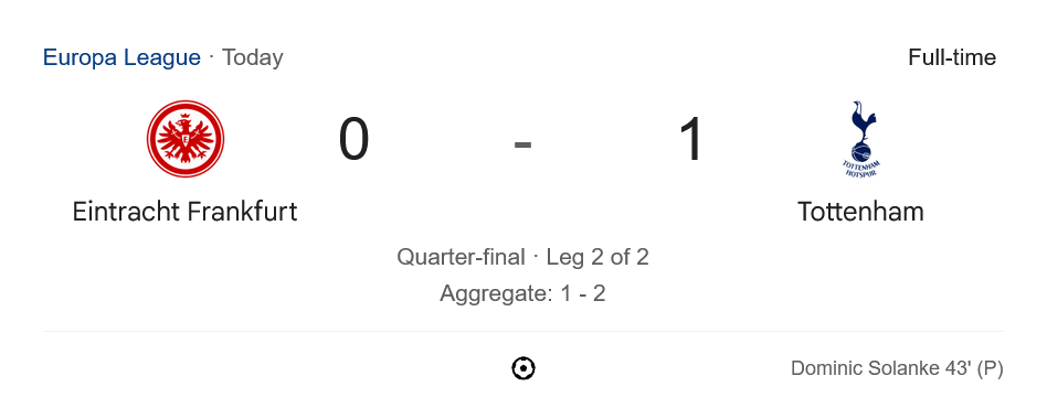 ชัยชนะ 1-0 ของสเปอร์สในนัดนี้ส่งผลให้พวกเขาผ่านเข้าสู่รอบรองชนะเลิศยูฟ่ายูโรปาลีก 2025 ด้วยสกอร์รวม 2-1 ขณะที่ไอน์ทรัค แฟร้งค์เฟิร์ตต้องอกหักจอดป้ายในรอบก่อนรองชนะเลิศอย่างน่าเสียดาย