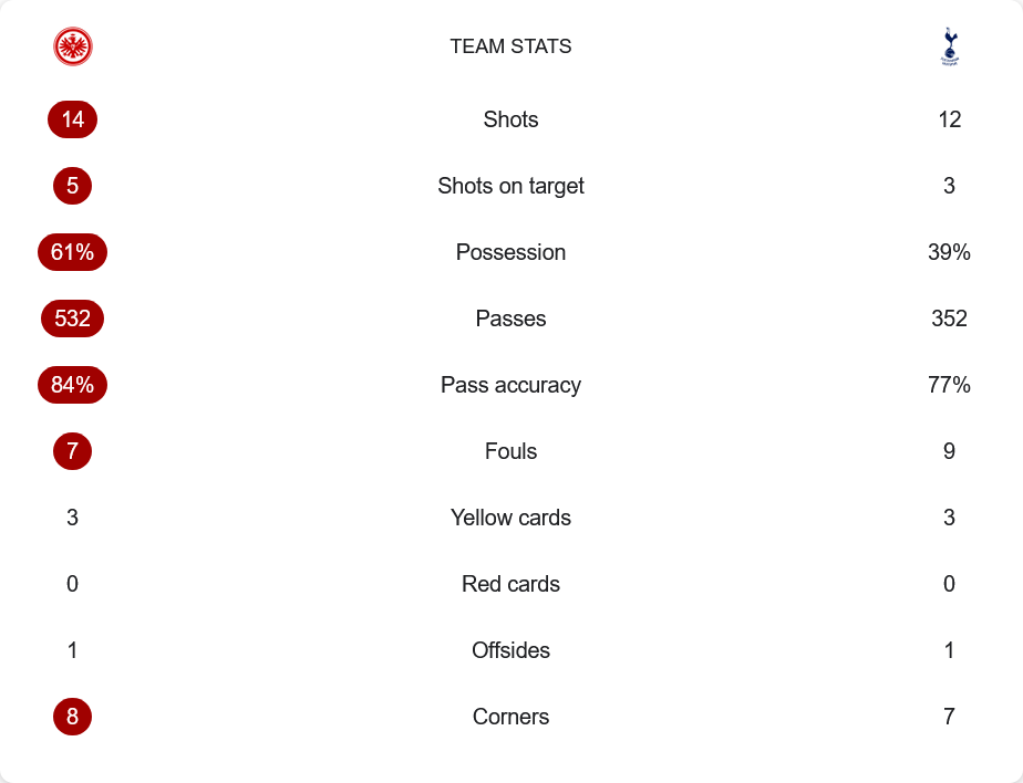 ตลอด 90 นาทีแฟร้งค์เฟิร์ตมีโอกาสยิง 14 ครั้ง เข้ากรอบ 5 ครั้ง ครองบอลได้ถึง 61% และจ่ายบอลสำเร็จ 84% จาก 532 ครั้ง ขณะที่สเปอร์สแม้ครองบอลเพียง 39% แต่เปลี่ยนจังหวะสวนกลับได้อันตราย ยิงรวม 12 ครั้งและเข้ากรอบ 3 ครั้ง แม้การจ่ายบอลจะสำเร็จน้อยกว่าที่ 77% จาก 352 ครั้ง แต่ความแน่นอนในเกมรับและการเปลี่ยนโอกาสเป็นสกอร์คือกุญแจสำคัญสู่ชัยชนะครั้งนี้