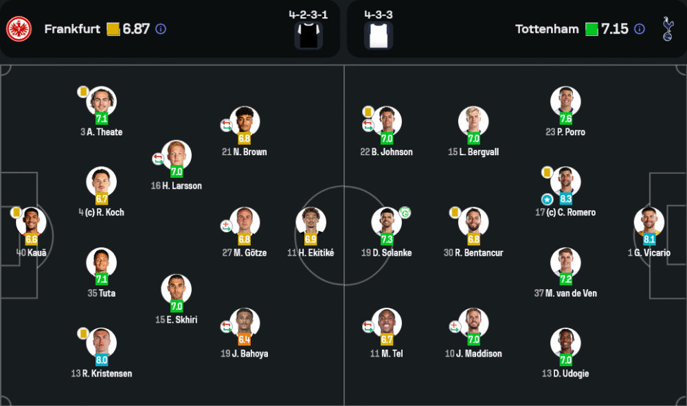 คริสเตียน โรเมโร่ ปราการหลังตัวแกร่งของท็อตแน่ม ฮ็อทสเปอร์ โชว์ฟอร์มสมบูรณ์แบบ ประกบเกมรุกของแฟร้งค์เฟิร์ตอยู่หมัด ช่วยทีมรอดพ้นจากความกดดันตลอดทั้งเกม พร้อมได้เรตติ้งสูงถึง 8.3 สมศักดิ์ศรีกัปตันทีมตัวจริง