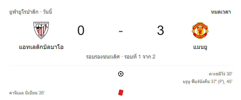 ศึกยูฟ่ายูโรปาลีก 2025 รอบรองชนะเลิศ เลกแรก กลายเป็นวันที่ แมนเชสเตอร์ ยูไนเต็ด บุกพิฆาตเจ้าถิ่น แอธเลติก บิลเบา ได้อย่างเด็ดขาดด้วยสกอร์ 3-0 พร้อมความได้เปรียบมหาศาลก่อนกลับไปเล่นที่โอลด์ แทร็ฟฟอร์ด โดยเกมนี้มีทั้งประตู, จุดโทษ, ใบแดง และโอกาสเพียบ บ้านกีฬาเกาะติด ผลบอลสด แบบนาทีต่อนาทีเพื่อคุณโดยเฉพาะ!