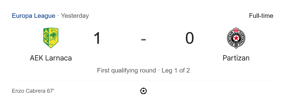 ศึกยูฟ่ายูโรปาลีก รอบคัดเลือก นัดแรกที่บ้านของ เออีเค ลาร์นาก้า จบลงด้วยผล บ้านผลบอล สุดมันส์ เมื่อเจ้าบ้านเฉือนเอาชนะ ปาร์ติซาน เบลเกรด แบบหืดจับ 1-0 จากประตูชัยของ เอนโซ กาเบรร่า นาที 67 ส่งเสียงเชียร์กระหึ่มสนาม โอกาสเข้ารอบต่อไปสดใสกว่าเดิม ก่อนบุกไปเยือนเบลเกรดนัดสอง