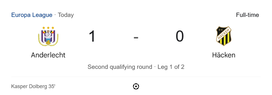 ศึกยูฟ่า ยูโรปาลีก รอบคัดเลือกรอบสองนัดแรกเมื่อคืนนี้ อันเดอร์เลชท์ ทีมดังจากเบลเยียมเปิดบ้านเฉือนเอาชนะ ฮัคเค่น จากสวีเดนไปได้แบบหวุดหวิด 1-0 จากประตูชัยของ แคสเปอร์ โดลเบิร์ก ในนาทีที่ 35 ช่วยให้แฟนบอลเจ้าถิ่นได้เฮลั่น และยังตุนความได้เปรียบก่อนไปเยือนในเลกที่สองกลางสัปดาห์หน้า สำหรับแฟนบอลที่กำลังติดตาม ผลบอลสด ต้องบอกว่านัดนี้เข้มข้นตั้งแต่นาทีแรกจนจบเกมแบบแทบหายใจไม่ทั่วท้อง