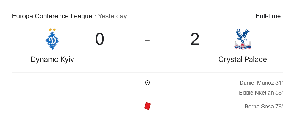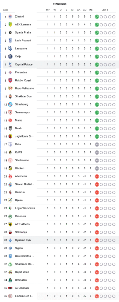 ชัยชนะเกมนี้ทำให้ คริสตัล พาเลซ เก็บ 3 คะแนนแรกในรอบแบ่งกลุ่ม ขึ้นมารั้งอันดับต้นของกลุ่ม มีความมั่นใจเต็มเปี่ยมก่อนเกมถัดไป ส่วน ดินาโม เคียฟ แพ้สองนัดรวด จมท้ายตาราง ต้องเร่งปรับเกมรุกและรับหากยังหวังเข้ารอบต่อไป