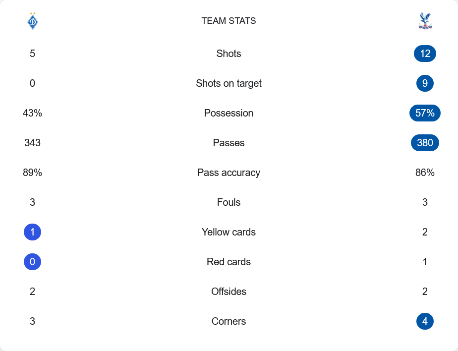 เกมนี้ คริสตัล พาเลซ ครองบอลเหนือกว่า 57% ยิงทั้งหมด 12 ครั้ง เข้ากรอบ 9 ครั้ง ขณะที่ ดินาโม เคียฟ มีโอกาสเพียง 5 ครั้งและไม่ตรงกรอบเลย การจ่ายบอลของพาเลซแม่นยำสูงถึง 86% จากจำนวน 380 ครั้ง ส่วนเคียฟจ่ายไป 343 ครั้ง แม่นยำ 89% แม้ตัวเลขใกล้เคียงแต่เกมรุกไม่คมพอ ทั้งสองทีมมีฟาวล์เท่ากัน 3 ครั้ง พาเลซได้เตะมุม 4 ครั้ง เคียฟ 3 ครั้ง ใบเหลืองรวมทั้งหมด 3 ใบ และมี 1 ใบแดงจากฝั่งเคียฟ