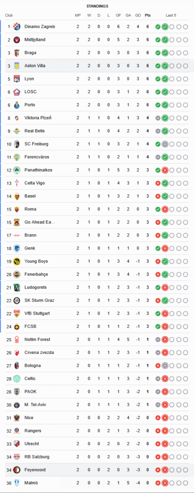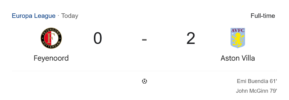หลังจบเกมนี้ แอสตัน วิลล่า มี 6 คะแนนเต็มจาก 2 นัด รั้งอันดับ 4 ของกลุ่มยูฟ่ายูโรปาลีก ร่วมกลุ่มจ่าฝูง ส่วน เฟเยนูร์ด ยังไม่มีแต้ม แพ้สองนัดรวด หล่นไปอยู่ท้ายตาราง ต้องเร่งปรับฟอร์มก่อนหลุดวงโคจรการแข่งขัน