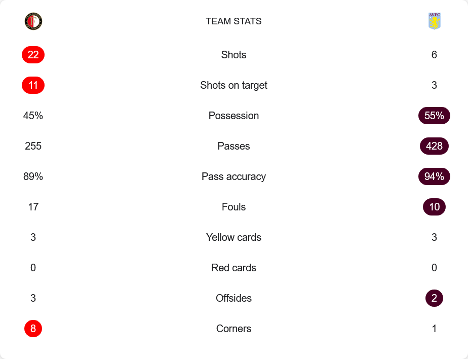 เกมนี้เฟเยนูร์ดมีโอกาสยิงถึง 22 ครั้ง เข้ากรอบ 11 แต่ไม่สามารถทำประตูได้เลย ครองบอล 45% ส่งบอล 255 ครั้ง ความแม่นยำ 89% ส่วนวิลล่าครองบอลมากกว่า 55% ส่งบอล 428 ครั้ง ความแม่นยำสูงถึง 94% ถึงแม้จะยิงเพียง 6 ครั้งแต่เปลี่ยนเป็น 2 ประตูเต็มประสิทธิภาพ ฟาวล์รวมกัน 27 ครั้ง ใบเหลืองฝั่งละ 3 ไม่มีใบแดง แสดงถึงเกมที่สูสีแต่ทีมเยือนเฉียบคมกว่า