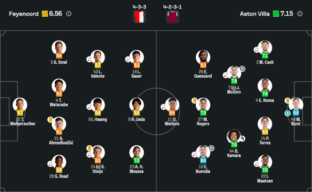 ครึ่งหลังกลายเป็นฝันร้ายของเจ้าบ้าน นาทีที่ 61 เอมิเลียโน่ บูเอนเดีย พังประตูแรกให้ทีมเยือนขึ้นนำ 1-0 จากการประสานงานสุดแม่นของบูบาการ์ กามาร่า และในนาทีที่ 79 จอห์น แม็คกินน์ กัปตันทีมซัดเม็ดสองปิดกล่อง วิลล่าควบคุมเกมไว้ได้ทั้งหมด แม้เฟเยนูร์ดจะพยายามไล่ยิงแต่ก็ไม่ผ่านมือบิซ็อตต์ จบเกม แอสตัน วิลล่าบุกชนะ 2-0 สุดแกร่ง