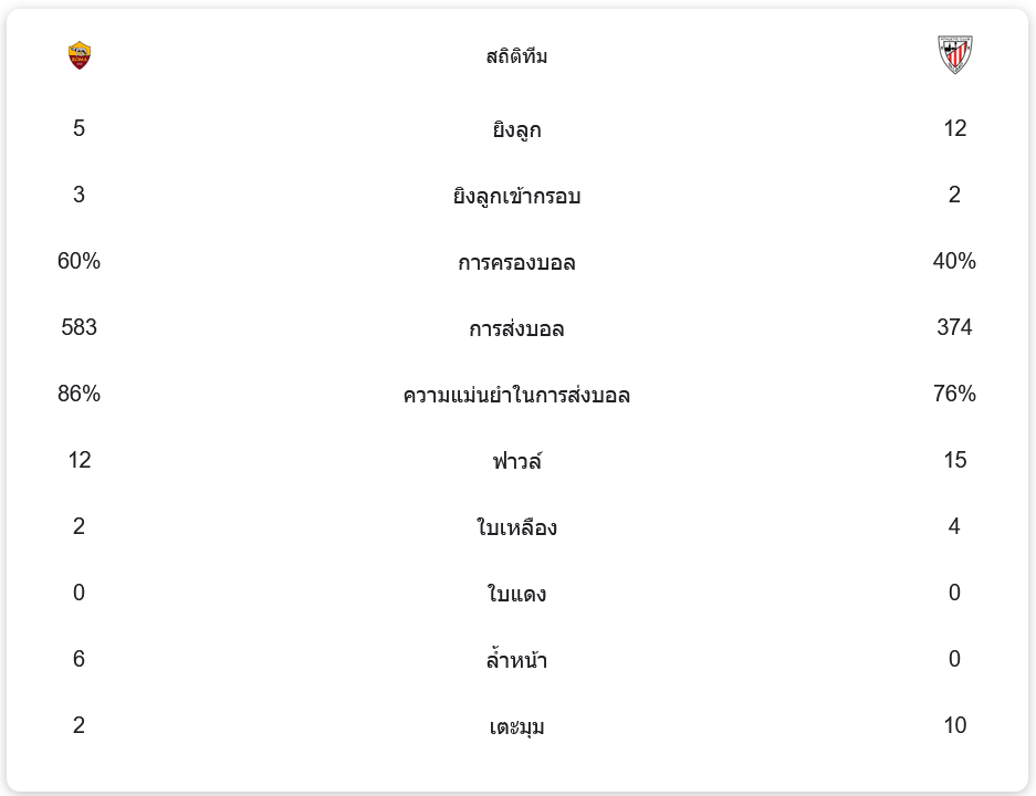 สถิติการแข่งขัน: แม้ว่า โรม่า จะครองบอลได้มากถึง 60% แต่โอกาสยิงเข้ากรอบกลับน้อยกว่า แอธเลติก บิลเบา ที่มีโอกาสยิงถึง 12 ครั้ง โดย โรม่า ยิงเข้ากรอบเพียง 3 ครั้งจากทั้งหมด 5 ครั้ง ส่วน แอธเลติก บิลเบา ยิงเข้ากรอบ 2 ครั้งจากทั้งหมด 12 ครั้ง การครองบอลของโรม่าอยู่ที่ 60% และแอธเลติก บิลเบา 40% การส่งบอลของโรม่าอยู่ที่ 583 ครั้ง และแอธเลติก บิลเบา 374 ครั้ง โรม่าแม่นยำในการส่งบอลถึง 86% ในขณะที่แอธเลติก บิลเบาทำได้ 76%