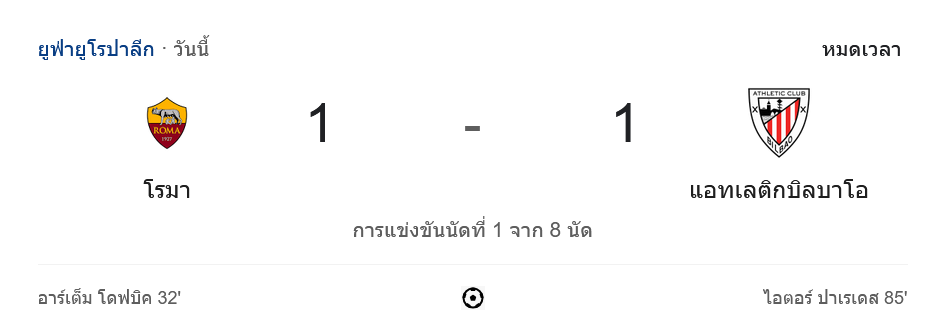 ครึ่งแรก: เกมระหว่าง เอเอส โรม่า และ แอธเลติก บิลเบา ในศึก ยูฟ่ายูโรปาลีก 2024 เริ่มต้นด้วยการบุกที่ดุเดือดทั้งสองฝั่ง โรม่าเริ่มต้นด้วยการครองบอลอย่างมั่นคง แต่การโจมตีของแอธเลติก บิลเบาก็ไม่เบา นาทีที่ 32 โรม่าได้ประตูขึ้นนำจากจังหวะการทำเกมอย่างเฉียบขาด อาร์เต็ม โดฟบิค เปิดบอลให้ โรม่า นำ 1-0 จนจบครึ่งแรก