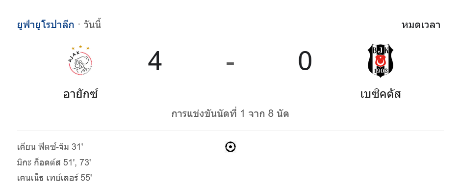 ครึ่งแรก: เกมระหว่าง อาแจกซ์ อัมสเตอร์ดัม และ เบซิคตัส เจเค ในศึก ยูฟ่ายูโรปาลีก 2024 รอบแบ่งกลุ่ม เปิดฉากด้วยการบุกอย่างหนักของอาแจกซ์ที่คุมเกมได้ตั้งแต่เริ่ม นาทีที่ 31 เป็น เคียน ฟิตซ์-จิม ที่ซัดประตูแรกของเกมให้ทีมขึ้นนำ 1-0 ก่อนจบครึ่งแรก ทิ้งให้เบซิคตัสที่พยายามหาจังหวะโต้กลับแต่ไม่สำเร็จ