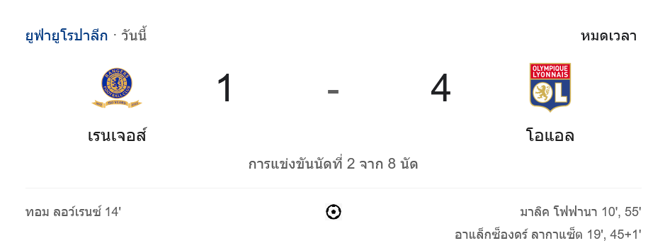 ลียงบุกถล่มเรนเจอร์ส 4-1 คว้าชัยศึกยูฟ่ายูโรปาลีก 2024