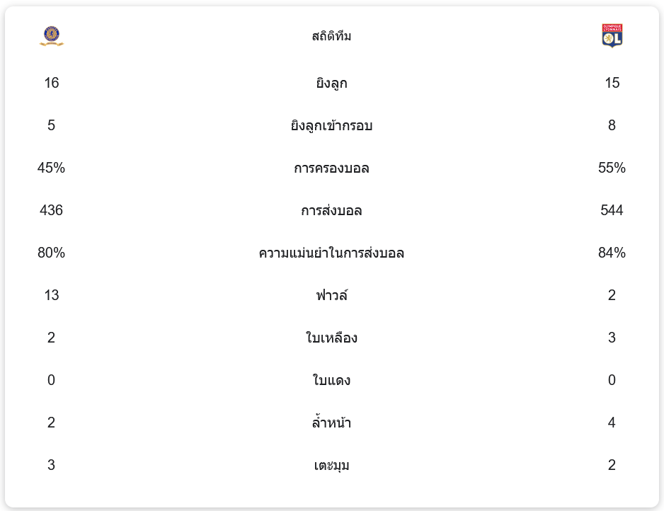 - 10′ มาลิค โฟฟานา ยิงให้ลียงนำ 1-0 จากการจ่ายของ เชอร์กี