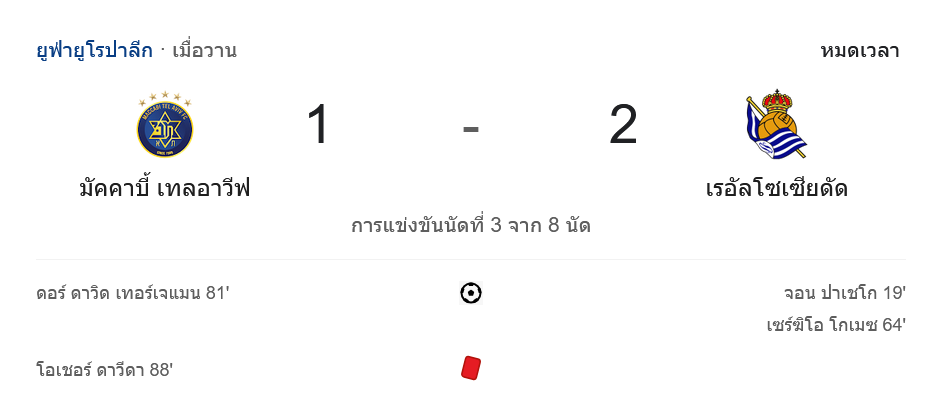 การแข่งขันฟุตบอล ยูฟ่ายูโรปาลีก 2024 รอบแบ่งกลุ่ม นัดที่ 3 ระหว่าง มัคคาบี้ เทลอาวีฟ และ เรอัล โซเซียดาด จบลงด้วยสกอร์ 1-2 ทีมเยือนจากสเปนคว้าชัยชนะอย่างยอดเยี่ยม พร้อมกับเก็บ 3 แต้มที่สำคัญในการแข่งขันนัดนี้ เกมนี้ จอน ปาเชโก และ เซร์ฆิโอ โกเมซ ทำประตูให้โซเซียดาด ขณะที่ ดอร์ เทอร์เจมัน ยิงประตูตีไข่แตกให้มัคคาบี้ในนาทีที่ 81