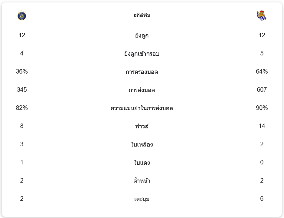แม้ว่า มัคคาบี้ เทลอาวีฟ จะพยายามยิงไปถึง 12 ครั้ง เท่ากับเรอัล โซเซียดาด แต่สถิติการครองบอลนั้นเป็นของทีมเยือนที่เหนือกว่า ด้วยการครองบอลถึง 64% และส่งบอลมากถึง 607 ครั้ง เมื่อเทียบกับเจ้าบ้านที่ครองบอลเพียง 36% และส่งบอลได้ 345 ครั้ง แสดงถึงการควบคุมเกมของโซเซียดาดที่ดีกว่า รวมถึงความแม่นยำในการส่งบอลที่สูงถึง 90%