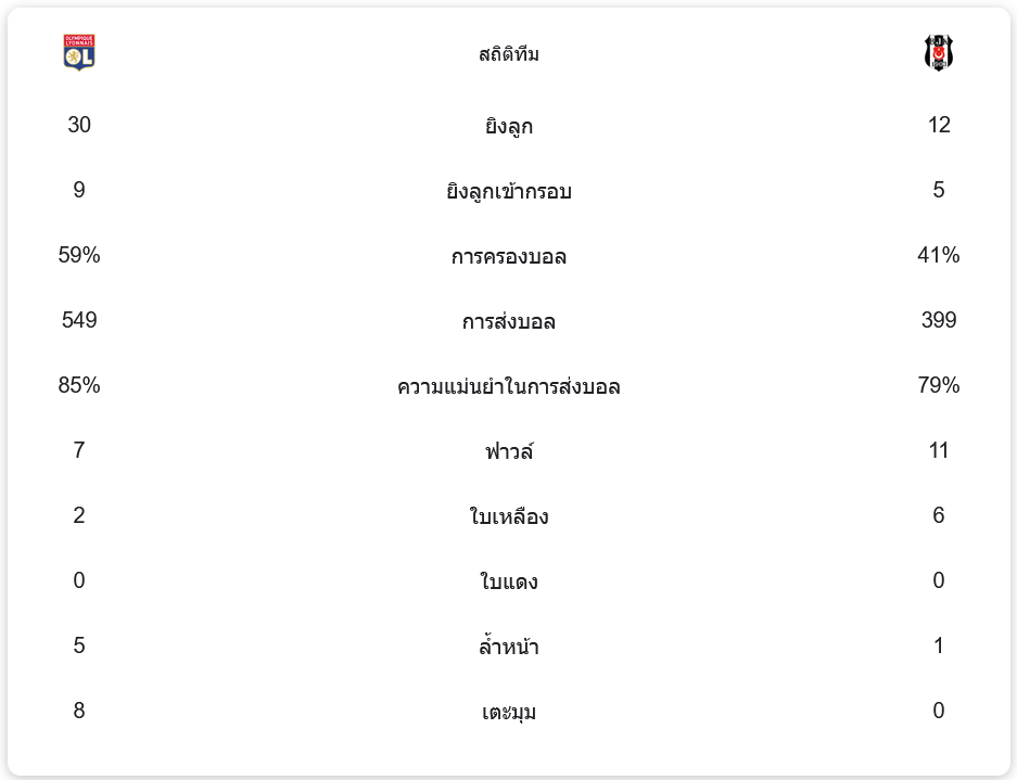 แม้ว่า โอลิมปิก ลียง จะครองเกมได้มากถึง 59% และมีโอกาสยิงถึง 30 ครั้ง เมื่อเทียบกับ เบซิคตัส ที่ยิงเพียง 12 ครั้ง แต่ความเฉียบขาดของเบซิคตัสทำให้พวกเขาเก็บชัยชนะได้ การส่งบอลของลียงมีความแม่นยำ 85% สูงกว่าเบซิคตัสที่มีความแม่นยำเพียง 79% แต่อย่างไรก็ตาม การเล่นอย่างรัดกุมของเบซิคตัสก็ทำให้พวกเขาเป็นฝ่ายชนะ