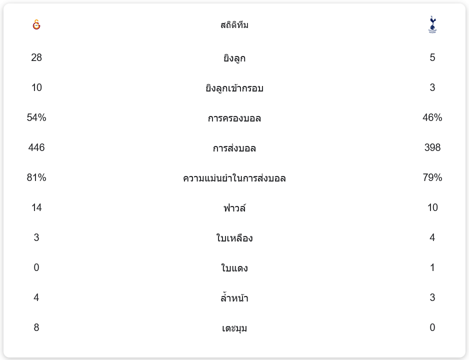 ในเกมนี้ กาลาตาซาราย มีการครองบอล 54% และยิงทั้งหมด 28 ครั้ง โดยยิงเข้ากรอบถึง 10 ครั้ง ขณะที่ ท็อตแน่ม ฮ็อทสเปอร์ ยิงทั้งหมดเพียง 5 ครั้ง และยิงเข้ากรอบ 3 ครั้ง การส่งบอลของกาลาตาซารายมีความแม่นยำ 81% จากการส่งบอลทั้งหมด 446 ครั้ง ส่วนสเปอร์สส่งบอล 398 ครั้ง และมีความแม่นยำที่ 79% เกมนี้มีการฟาวล์ถึง 14 ครั้ง จากฝั่งกาลาตาซาราย และ 10 ครั้ง จากฝั่งสเปอร์ส โดยทีมเยือนได้รับใบแดง 1 ใบในช่วงครึ่งหลัง