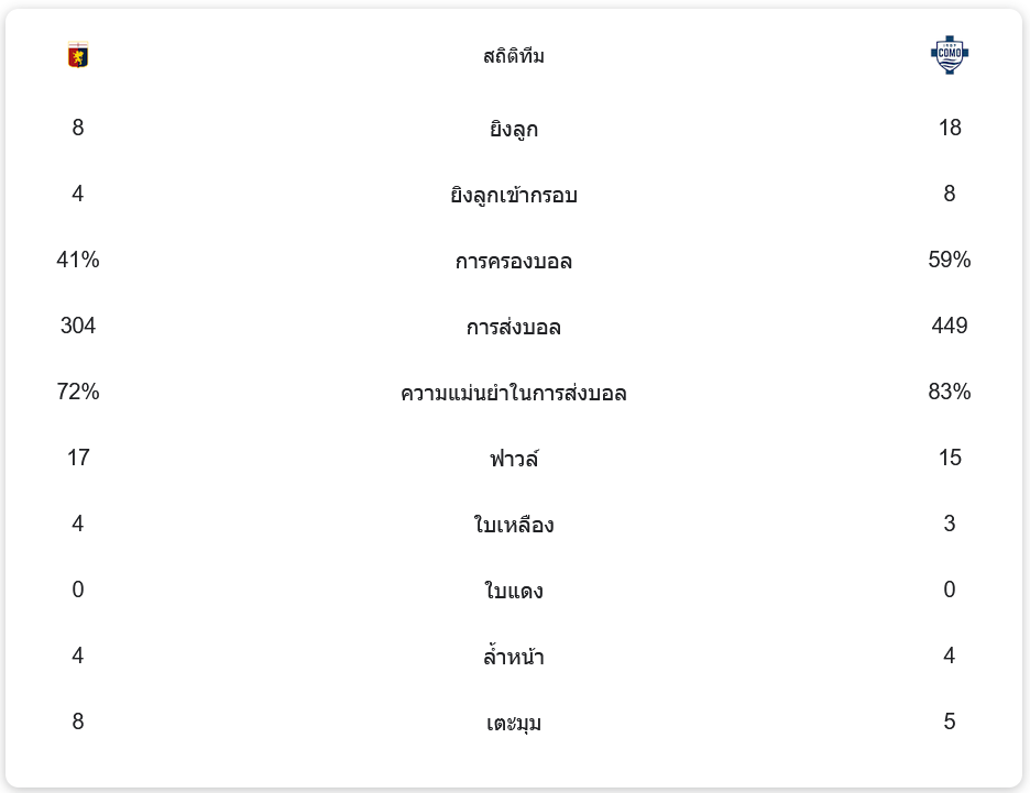 ในเกมนี้ โคโม ครองบอลได้มากกว่าด้วยสัดส่วน 59% และมีโอกาสยิงทั้งหมด 18 ครั้ง โดยยิงเข้ากรอบ 8 ครั้ง ขณะที่ เจนัว มีโอกาสยิงเพียง 8 ครั้ง และยิงเข้ากรอบ 4 ครั้ง เจนัวมีการส่งบอลเพียง 304 ครั้ง ด้วยความแม่นยำ 72% ขณะที่โคโมมีการส่งบอล 449 ครั้ง ด้วยความแม่นยำถึง 83% เกมนี้มีการฟาวล์มากถึง 17 ครั้ง จากเจนัว และ 15 ครั้ง จากโคโม โดยทีมเจ้าบ้านได้รับใบเหลืองถึง 4 ใบ ส่วนทีมเยือนโดนไป 3 ใบเหลือง