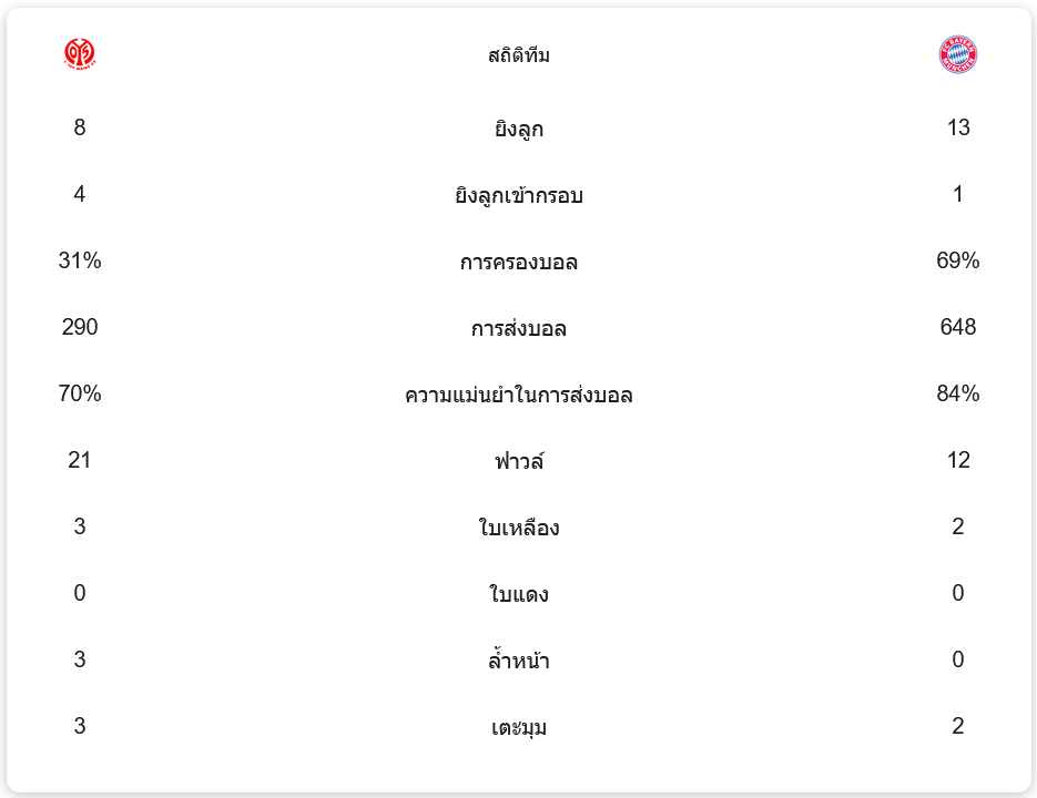 ไมนซ์มีโอกาสยิงทั้งหมด 8 ครั้ง โดยเข้ากรอบ 4 ส่วนบาเยิร์นยิง 13 ครั้ง แต่เข้ากรอบเพียง 1 ความแม่นยำในการส่งบอลของบาเยิร์นอยู่ที่ 84% ขณะที่ไมนซ์ทำได้ 70% ฟาวล์รวมทั้งสองทีมอยู่ที่ 33 ครั้ง แสดงให้เห็นถึงความดุเดือดของเกมนี้
