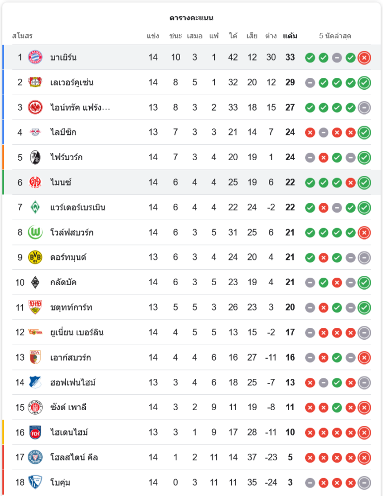 ไมนซ์ขยับขึ้นมาอยู่ที่ 6 ด้วยคะแนน 22 แต้ม ส่วนบาเยิร์นยังคงนำจ่าฝูงที่ 33 แต้ม แต่ช่องว่างเริ่มน้อยลง ทำให้ศึกชิงแชมป์บุนเดสลีกายิ่งเข้มข้น