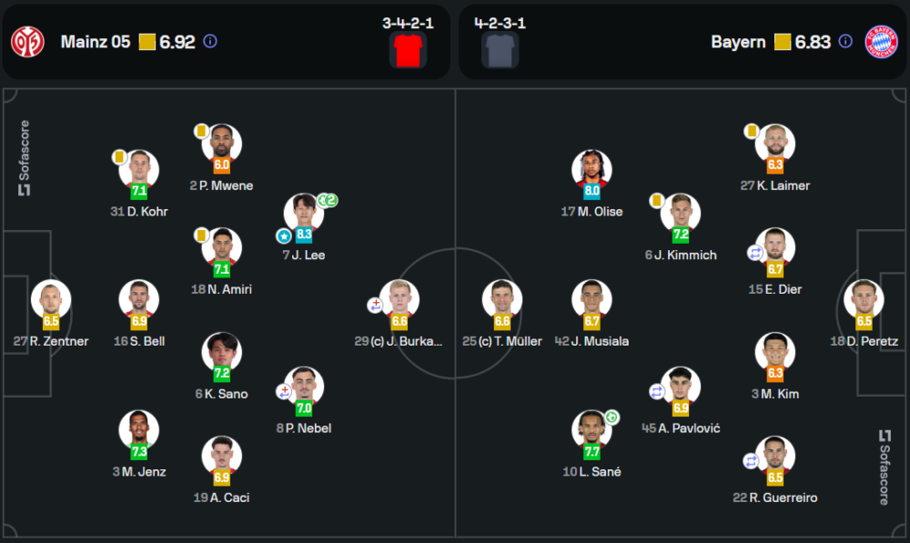 ไมนซ์เริ่มต้นได้อย่างน่าประทับใจด้วยการทำประตูขึ้นนำในนาทีที่ 41 จากการยิงของ อี แจ-ซอง ที่โชว์ทักษะยอดเยี่ยมเอาชนะแนวรับบาเยิร์น แม้ว่าทีมเยือนจะครองบอลได้มากกว่า แต่ความเฉียบขาดของไมนซ์ทำให้พวกเขาจบครึ่งแรกด้วยความได้เปรียบ 1-0