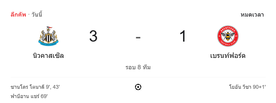 นิวคาสเซิ่ลยังคงเล่นเกมบุกต่อเนื่อง นาทีที่ 69 ฟาเบียน แชร์ ยิงประตูที่สามจากการเปิดบอลของ บรูโน่ กิมาไรส์ ทำให้สกอร์ทิ้งห่างเป็น 3-0 แม้ว่าในช่วงทดเวลา เบรนท์ฟอร์ดจะตีไข่แตกได้จาก โยอัน วิสซา ในนาทีที่ 90+1 แต่ก็ไม่เพียงพอ จบเกมนิวคาสเซิ่ลชนะไป 3-1