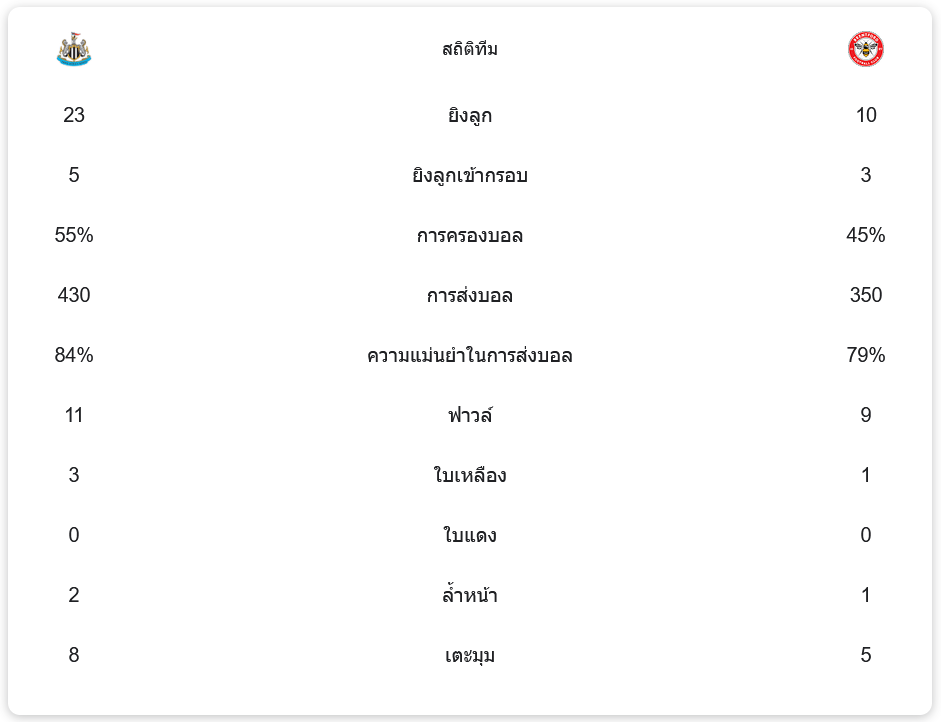นิวคาสเซิ่ลครองบอลได้ 55% และมีโอกาสยิงถึง 23 ครั้ง โดยยิงเข้ากรอบ 5 ครั้ง ส่วนเบรนท์ฟอร์ดมีโอกาสยิง 10 ครั้ง และเข้ากรอบ 3 ครั้ง ความแม่นยำในการจ่ายบอลของนิวคาสเซิ่ลอยู่ที่ 84% เทียบกับ 79% ของเบรนท์ฟอร์ด เกมนี้แสดงให้เห็นถึงความเหนือชั้นในเกมรุกของนิวคาสเซิ่ล