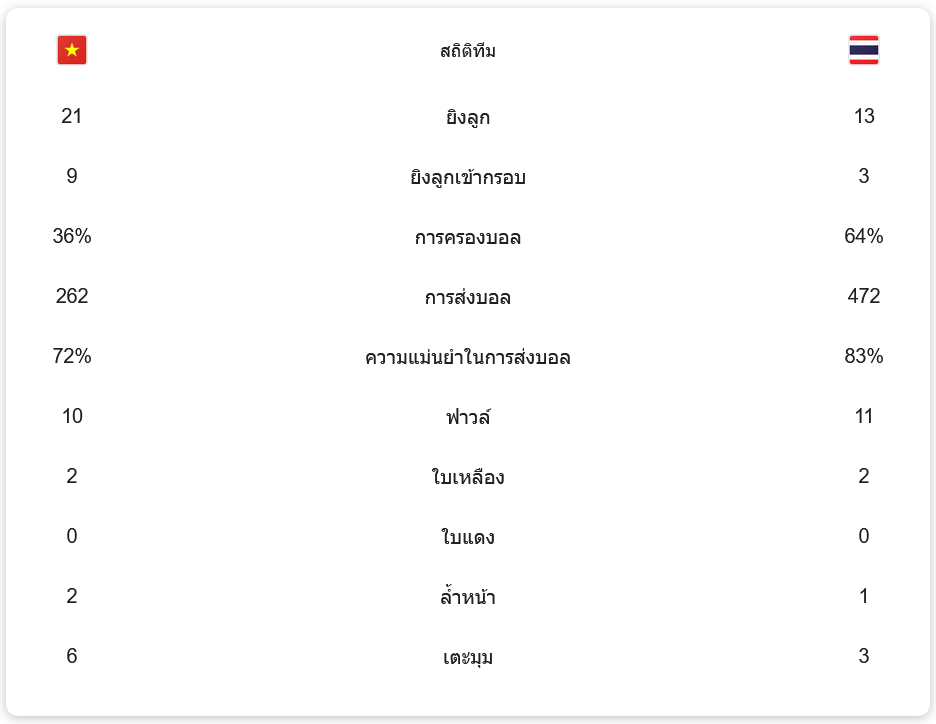 เกมนี้ไทยครองบอลได้ถึง 64% แต่โอกาสยิงของเวียดนามมีมากถึง 21 ครั้ง โดยเข้ากรอบ 9 ครั้ง ขณะที่ไทยยิง 13 ครั้ง เข้ากรอบเพียง 3 ครั้ง ความแม่นยำในการส่งบอลของไทยอยู่ที่ 83% สูงกว่าเวียดนามที่ 72% อย่างไรก็ตาม ความเฉียบขาดของแนวรุกเวียดนามคือสิ่งที่สร้างความแตกต่างในเกมนี้