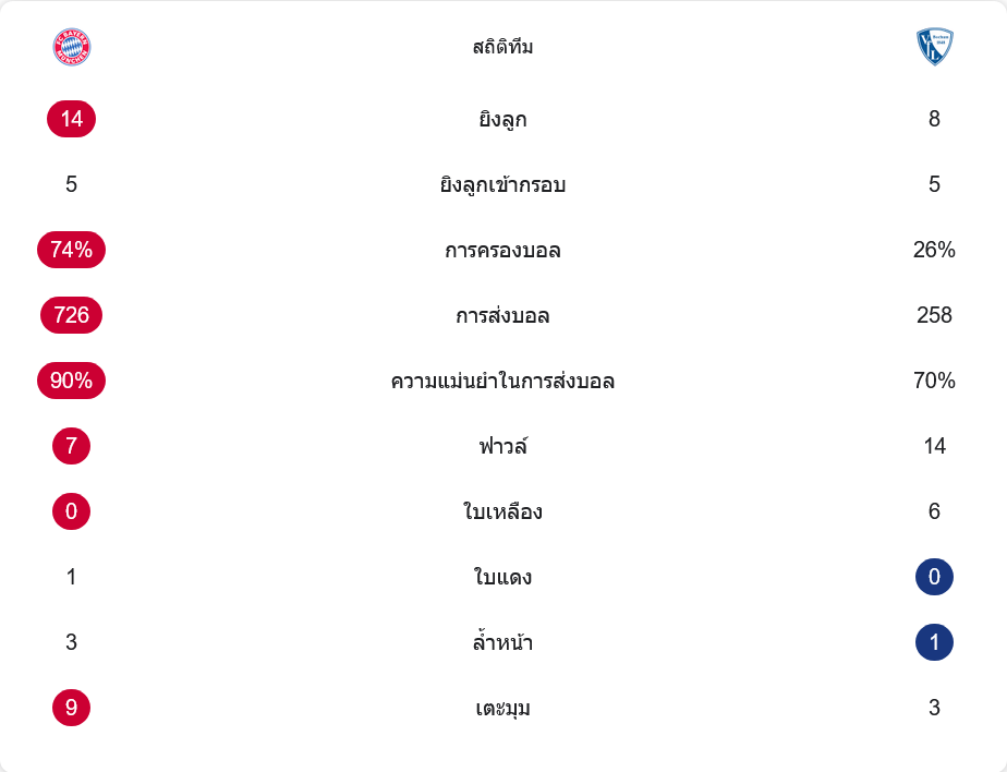 เกมนี้ บาเยิร์น ครองบอลมากถึง 74% ยิงทั้งหมด 14 ครั้ง เข้ากรอบ 5 ครั้ง จ่ายบอลถึง 726 ครั้ง ความแม่นยำ 90% ด้านโบคุ่ม แม้ครองบอลเพียง 26% แต่การจบสกอร์ที่เฉียบคม (ยิง 8 เข้ากรอบ 5) ทำให้พวกเขาคว้าชัยไปอย่างเหลือเชื่อ