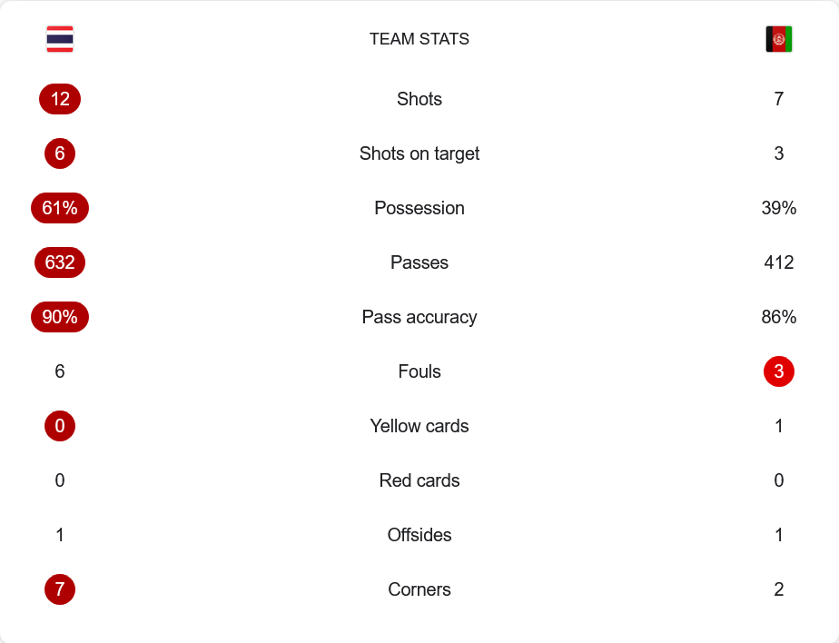 ทีมชาติไทยครองบอลมากถึง 61% เทียบกับอัฟกานิสถานที่มีเพียง 39% ไทยยิงรวม 12 ครั้ง เข้ากรอบ 6 ส่วนอัฟกานิสถานยิงไป 7 ครั้ง เข้ากรอบ 3 ไทยผ่านบอลสำเร็จถึง 632 ครั้งด้วยความแม่นยำ 90% ในขณะที่อัฟกานิสถานผ่านบอล 412 ครั้ง ด้วยความแม่นยำ 86% ทีมชาติไทยยังได้ลูกเตะมุมถึง 7 ครั้ง ส่วนอัฟกานิสถานได้เพียง 2 ครั้ง และในเรื่องของวินัยการเล่น ไทยทำฟาวล์ 6 ครั้ง ไม่มีใบเหลือง ส่วนอัฟกานิสถานทำฟาวล์ 3 ครั้ง และโดนใบเหลือง 1 ใบ