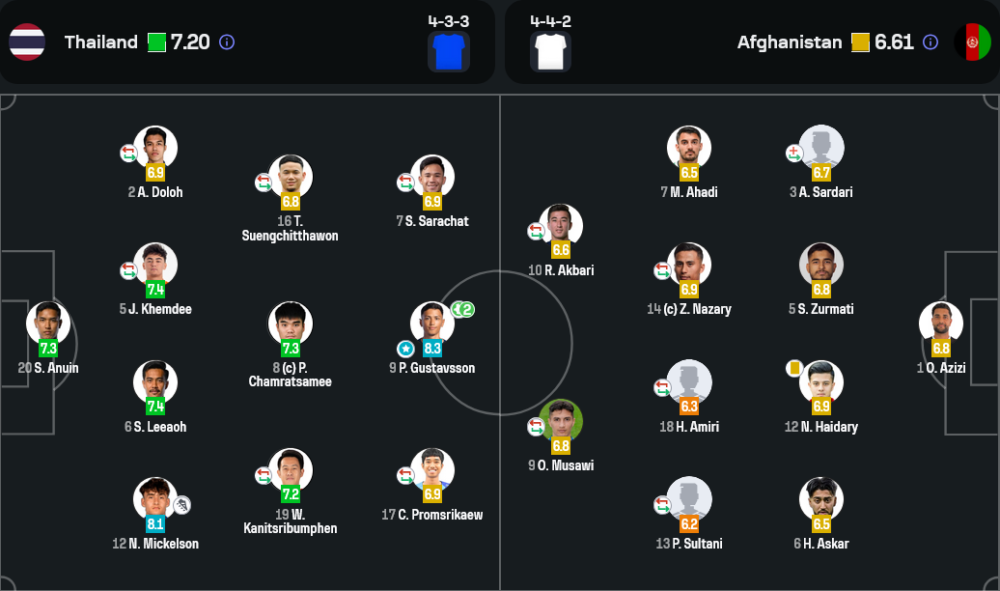 ฝั่งอัฟกานิสถานในระบบ 4-4-2 ใช้เกมริมเส้นและการโยนบอลยาวเป็นจุดหลัก แต่ยังขาดประสิทธิภาพในจังหวะสุดท้าย แม้จะพยายามเปิดพื้นที่เข้าทำบ่อยครั้งแต่ก็ไม่สามารถเจาะแนวรับไทยที่วางตำแหน่งได้ดี ความต่างในเกมนี้คือความแม่นยำและจังหวะเข้าทำ ซึ่งไทยทำได้ดีกว่าอย่างชัดเจน และเมื่อพิจารณาจากมุม วิเคราะห์บอล แล้ว ไทยมีความหลากหลายในการเข้าทำมากกว่าและอ่านเกมได้แม่นยำกว่าอัฟกานิสถานทุกระยะ