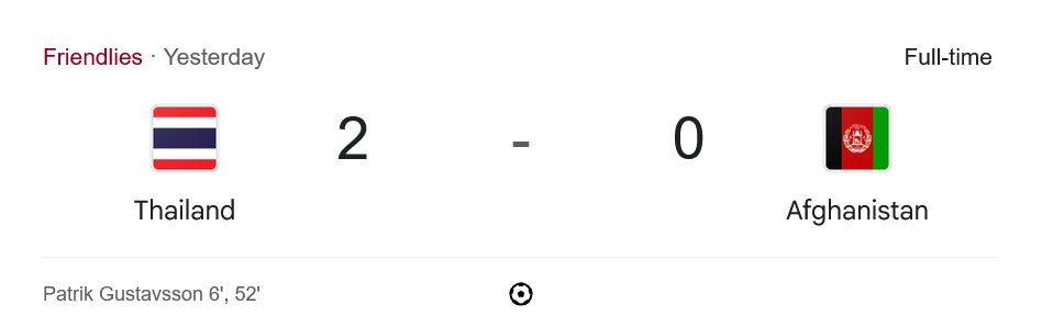 ศึกกระชับมิตรทีมชาติประจำปี 2025 นัดที่ทีมชาติไทยลงสนามต้อนรับการมาเยือนของทีมชาติอัฟกานิสถาน กลายเป็นแมตช์ที่แฟนบอลไทยได้เฮกันถ้วนหน้า เมื่อขุนพล “ช้างศึก” โชว์ฟอร์มแกร่งไล่บดเอาชนะผู้มาเยือนไปด้วยสกอร์ 2-0 จากผลงานของดาวยิงตัวความหวังอย่าง แพทริค กุสตาฟส์สัน ที่จัดคนเดียวสองประตูตั้งแต่ครึ่งแรกและต้นครึ่งหลัง โดยในเกมนี้ ผลบอลสด จากทุกสำนักต่างยกให้ไทยเหนือกว่าทั้งรูปเกมและความเฉียบคมตลอด 90 นาที