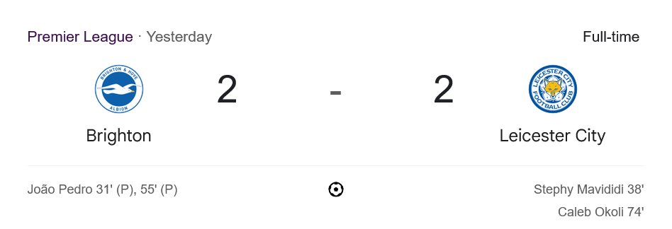 ศึก พรีเมียร์ลีก 2025 เมื่อคืนที่ผ่านมา กลายเป็นอีกหนึ่งเกมมันส์แห่งสัปดาห์ที่ ไบรท์ตัน แอนด์ โฮฟ อัลเบี้ยน เปิดบ้านต้อนรับการมาเยือนของ เลสเตอร์ ซิตี้ และทั้งสองทีมต่างงัดฟอร์มเดือดใส่กันแบบไม่มีใครยอมใคร ก่อนจะแบ่งแต้มกันไปด้วยสกอร์ 2-2 ท่ามกลางเสียงเชียร์ของแฟนบอลกว่า 30,000 คน พร้อมความดราม่าจากจุดโทษถึง 2 หนในเกมเดียว ซึ่ง ผลบอลสด คู่นี้ก็เต็มไปด้วยความเข้มข้นตั้งแต่นาทีแรกจนสิ้นเสียงนกหวีด