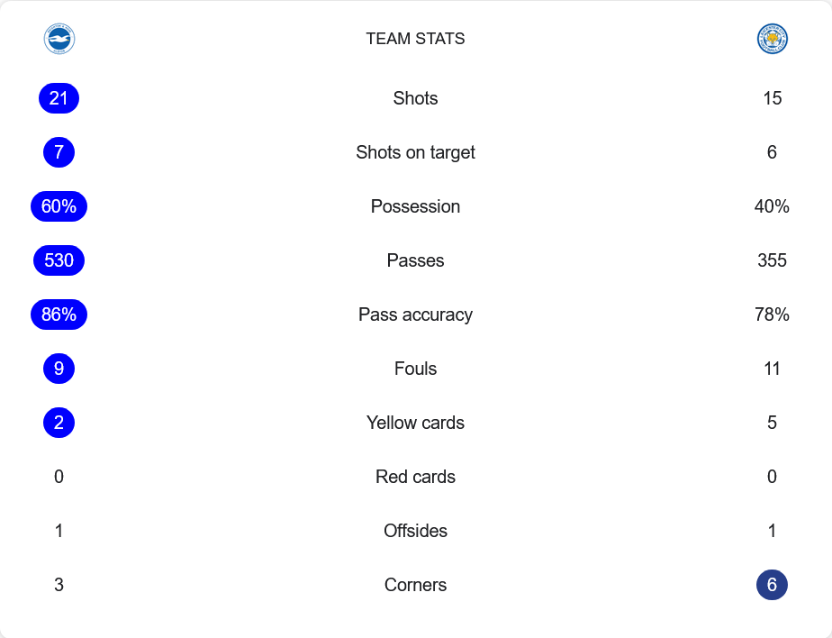 ไบรท์ตันครองบอลเหนือกว่าที่ 60% สร้างโอกาสยิงได้ถึง 21 ครั้ง เข้ากรอบ 7 ครั้ง แสดงให้เห็นถึงเกมรุกที่หลากหลายและต่อเนื่อง ส่วนเลสเตอร์แม้จะครองบอลเพียง 40% แต่ก็ยิงถึง 15 ครั้ง เข้ากรอบ 6 ครั้ง แสดงถึงประสิทธิภาพในการสวนกลับ การผ่านบอลของเจ้าบ้านอยู่ที่ 530 ครั้ง ด้วยความแม่นยำ 86% ขณะที่เลสเตอร์ผ่านบอล 355 ครั้ง ความแม่นยำ 78% เกมนี้ยังมีใบเหลืองรวม 7 ใบ โดยไบรท์ตันได้ไป 2 ใบ ส่วนเลสเตอร์โดนถึง 5 ใบ นอกจากนี้ เลสเตอร์ยังได้เตะมุมมากกว่า 6 ต่อ 3 แต่ไบรท์ตันเล่นบอลบนพื้นได้เหนือกว่าในรูปเกม