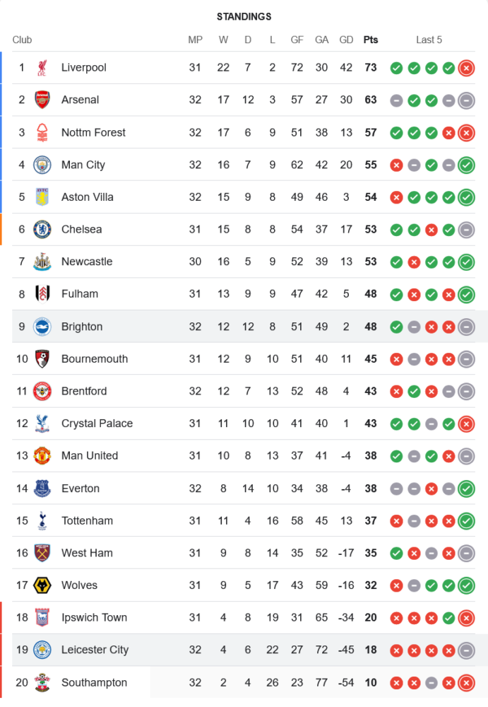 ขณะที่ เลสเตอร์ ซิตี้ ที่ยังจมโซนแดงและไม่ชนะใครมาหลายเกม จะเปิดบ้านรับมือจ่าฝูงอย่าง ลิเวอร์พูล ในวันที่ 20 เมษายน เวลา 22:30 น. ซึ่งถือเป็นบททดสอบหินแบบสุดขีด ก่อนจะบุกไปเยือน วูล์ฟแฮมป์ตัน ในวันที่ 26 เมษายน เวลา 21:00 น. นี่คือโค้งสุดท้ายที่พวกเขาต้องหาทางเก็บแต้มให้ได้ ไม่อย่างนั้นอาจต้องโบกมือลา ตารางบอลพรีเมียร์ลีก ไปในซีซั่นหน้า