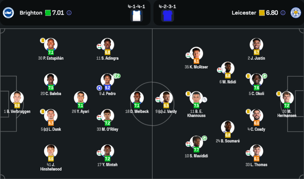 พระเอกของเกมนี้คือ ชูเอา เปโดร ที่คว้าคะแนนสูงสุด 9.2 พร้อมกับซัดสองจุดโทษสุดนิ่ง พาไบรท์ตันเก็บหนึ่งแต้มในบ้าน พร้อมเป็นจุดศูนย์กลางในเกมรุกทุกจังหวะ การจ่ายบอลของเขาแม่นยำ วิ่งไม่มีหมด และยืนตำแหน่งได้ยอดเยี่ยมตลอด 90 นาที ถือเป็นผู้นำทีมตัวจริงในค่ำคืนนี้