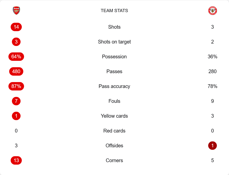 ตลอดทั้งเกม อาร์เซนอลมีโอกาสยิงมากถึง 14 ครั้ง เข้ากรอบ 3 ครั้ง ถือว่าต่ำเมื่อเทียบกับการครองบอลที่สูงถึง 64% กับจำนวนการผ่านบอลที่มากถึง 480 ครั้ง และความแม่นยำในการจ่ายที่ 87% ขณะที่ เบรนท์ฟอร์ด มีโอกาสยิงเพียง 3 ครั้ง แต่เปลี่ยนเป็นประตูได้ 1 ครั้ง บ่งบอกถึงความเฉียบขาดและมีประสิทธิภาพ ทีมเยือนทำฟาวล์ 9 ครั้ง ได้ใบเหลือง 3 ใบ ส่วนอาร์เซนอลทำฟาวล์ 7 ครั้ง และโดนใบเหลืองเพียงใบเดียว ด้านลูกเตะมุม อาร์เซนอลได้มากถึง 13 ครั้ง ขณะที่เบรนท์ฟอร์ดได้ 5 ครั้ง