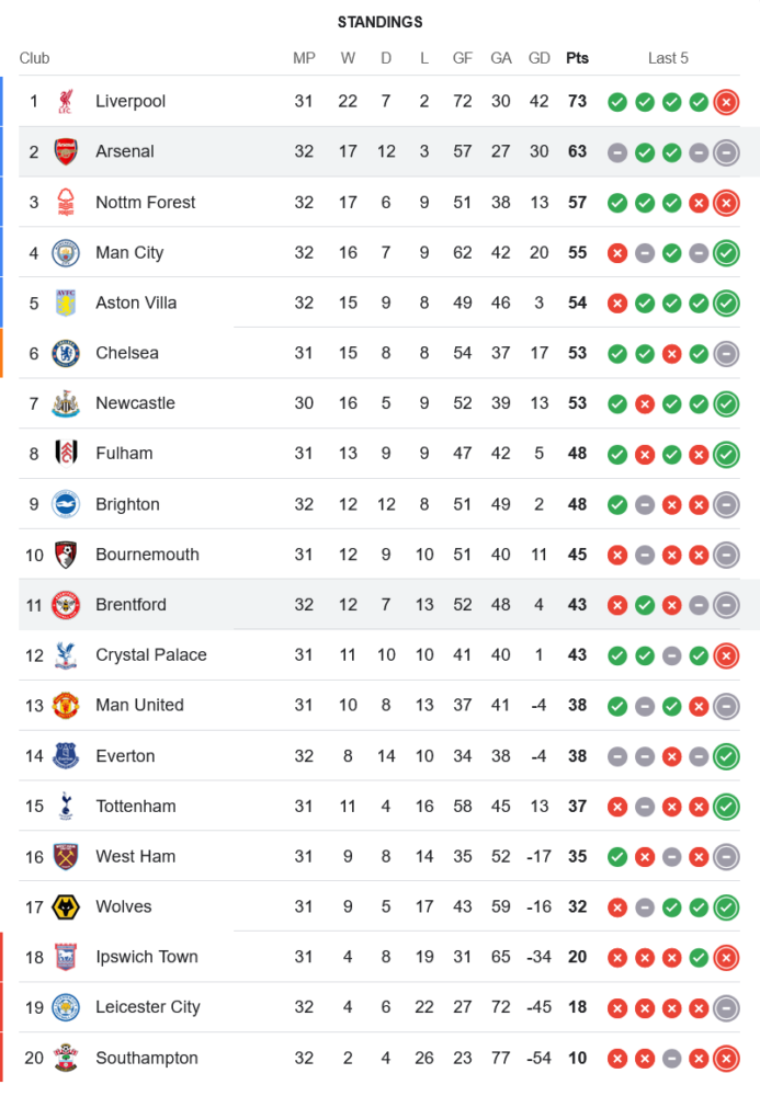 ผลเสมอนัดนี้ทำให้ อาร์เซนอล เก็บเพิ่มเป็น 63 คะแนน จาก 32 นัด รั้งอันดับ 2 ตามหลังลิเวอร์พูล 10 แต้ม และโดน น็อตติ้งแฮม ฟอเรสต์ ขยับขึ้นมาไล่จี้ห่างเพียง 6 แต้ม เบรนท์ฟอร์ดขยับเป็น 43 แต้ม รั้งอันดับ 11 ของตาราง ยังมีลุ้นไต่อันดับขึ้นมาแซงพวกกลางตาราง หากรักษาฟอร์มได้ต่อเนื่อง