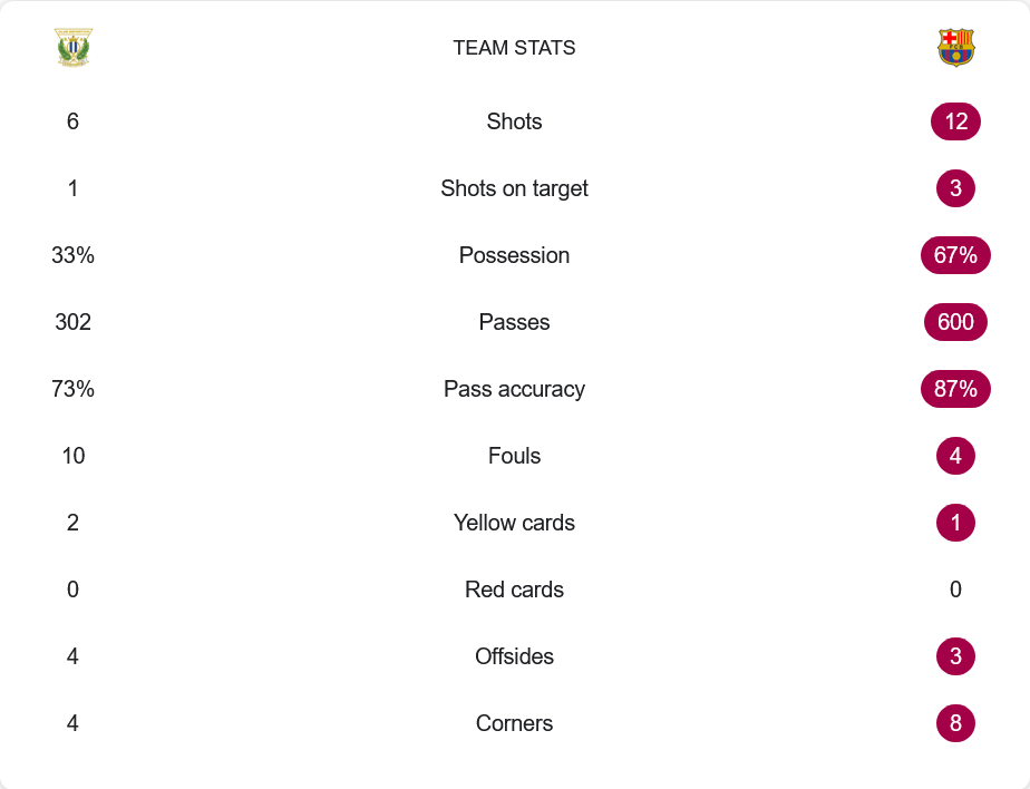 แม้บาร์เซโลน่าจะยิงเข้ากรอบเพียง 3 จาก 12 ครั้ง แต่พวกเขาครองบอลไปถึง 67% เทียบกับเลกาเนสที่มีเพียง 33% การผ่านบอลของบาร์ซ่าสูงถึง 600 ครั้ง และความแม่นยำอยู่ที่ 87% ซึ่งเหนือกว่าชัดเจนเมื่อเทียบกับเลกาเนสที่ผ่านบอล 302 ครั้ง และความแม่นยำที่ 73% จำนวนฟาวล์รวมในเกมนี้มีแค่ 14 ครั้ง โดยเจ้าบ้านทำถึง 10 ครั้ง ได้ใบเหลือง 2 ใบ ขณะที่ทีมเยือนฟาวล์ 4 ครั้งและได้ใบเหลือง 1 ใบ บาร์เซโลน่ายังได้เตะมุม 8 ครั้ง ขณะที่เลกาเนสได้ 4 ครั้ง ถือเป็นอีกหนึ่งเกมที่ทีมเยือนควบคุมสถานการณ์ไว้ได้ทั้งหมด