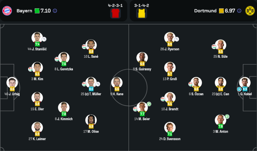 เกรเกอร์ โคเบล นายด่านของดอร์ทมุนด์ได้รับตำแหน่ง Player of the Match ด้วยคะแนนสูงถึง 8.9 จากผลงานการเซฟถึง 9 ครั้ง ช่วยชีวิตทีมไว้หลายต่อหลายหน โดยเฉพาะในช่วงครึ่งหลังที่บาเยิร์นบุกหนัก เขาคือกำแพงที่ทำให้ดอร์ทมุนด์มีแต้มกลับออกไปจากอัลลิอันซ์ อารีน่า