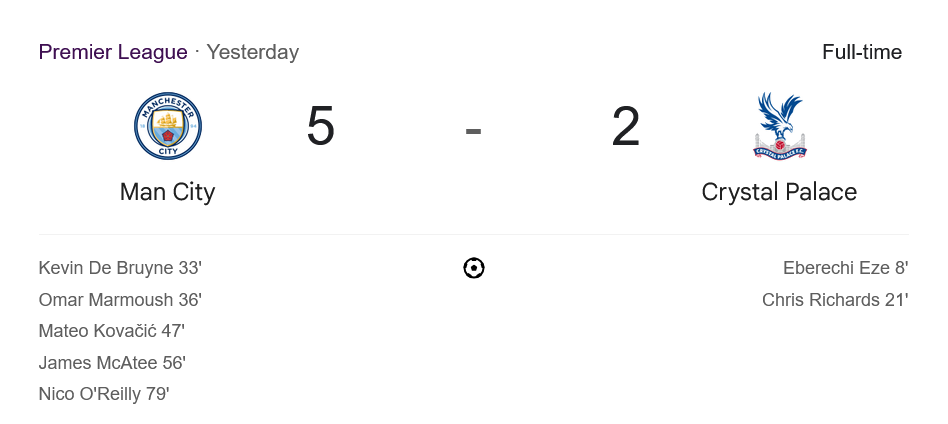 สเตฟาน ออร์เตก้า (71′), ออสการ์ บ็อบบ์ (82′), ซาวินโญ่ (82′), แจ็ค กรีลิช (87′), เฌเรมี่ โดกู (87′)