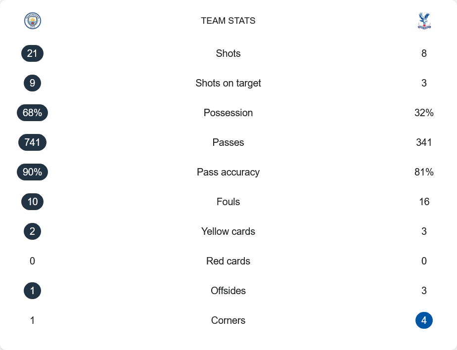 แมนเชสเตอร์ ซิตี้แสดงให้เห็นถึงความเหนือชั้นตลอดทั้งเกมด้วยการครองบอลมากถึง 68% และสร้างสรรค์โอกาสยิงถึง 21 ครั้ง เข้ากรอบ 9 ครั้ง เทียบกับพาเลซที่ยิงได้เพียง 8 ครั้ง เข้ากรอบ 3 ครั้งเท่านั้น ทีมของเป๊ปผ่านบอลไปถึง 741 ครั้ง และมีความแม่นยำสูงถึง 90% ในขณะที่พาเลซผ่านบอลแค่ 341 ครั้ง ด้วยความแม่นยำ 81% ด้านเกมรับ แมนฯ ซิตี้เสียฟาวล์เพียง 10 ครั้ง ใบเหลือง 2 ใบ ขณะที่พาเลซเสียถึง 16 ฟาวล์ และโดนใบเหลือง 3 ใบ พาเลซยังได้เตะมุมมากกว่าที่ 4 ครั้ง เทียบกับของซิตี้เพียง 1 ครั้ง