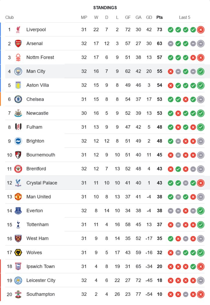 ชัยชนะนัดนี้ทำให้ แมนเชสเตอร์ ซิตี้ ขยับแต้มเพิ่มเป็น 55 คะแนนจาก 32 นัด ยึดอันดับ 4 ต่อไป พร้อมเบียดบี้หัวตารางที่ยังมีลุ้นพื้นที่ยุโรปเต็มตัว ขณะที่ คริสตัล พาเลซ ยังคงมี 43 แต้มจาก 31 นัด รั้งอันดับ 12 และต้องรีบกลับมาเก็บแต้มให้ได้เพื่อความปลอดภัยในช่วงท้ายฤดูกาล
